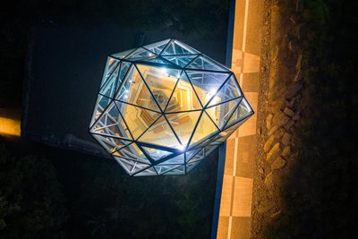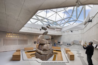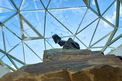 Aus dem Boden erstreckt sich eine defragmentierende Felsformation, die durch die gläserne Decke der Ausstellung nach oben wächst. Stein wird zu Glas und gibt die Mythen und Geheimnisse symbolisch frei. Der glitzernde Fels, bestehend aus über 100 schimmernden Glasscheiben, wirkt schon von außen schon magisch.
